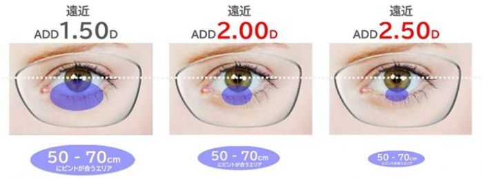 おっしゃる老眼度数に当たるのが加入度です。この加入度を上げるにつれて、遠近では