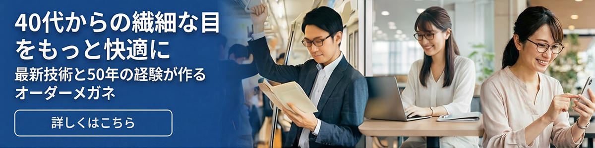 働き盛りの方が悩んでいる見え方の低下や目の疲れ。今使ってるメガネだとPCやスマホが見えづらいから仕事に集中できない、など「スマホ老眼」と呼ばれる症状に悩まされる30代~50代の方も多くいらっしゃいます。「見える」だけではなく「楽に見える」「疲れない」メガネ。あなたにぴったりの眼鏡を見つけて、視力の変化を快適に乗り越えましょう。