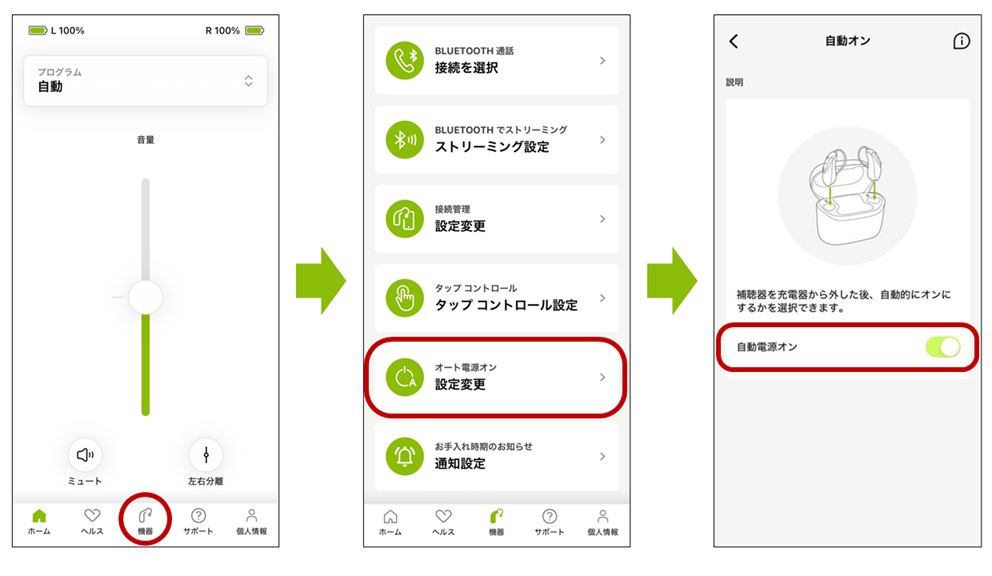【自動電源オン機能】が有効にもかかわらず補聴器が自動でオンにならない場合は、次のステップに進んでください。