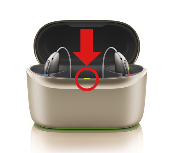 「蓄電タイプ充電器(フォナック チャージャーGo スフィア / フォナック チャージャーGo I 等)」をお使いの方は、お知らせLEDランプをご確認ください。 充電器の内蔵電池が充電されていない場合、お知らせLEDランプは赤色に点灯し、自動電源オン機能は動作しません。