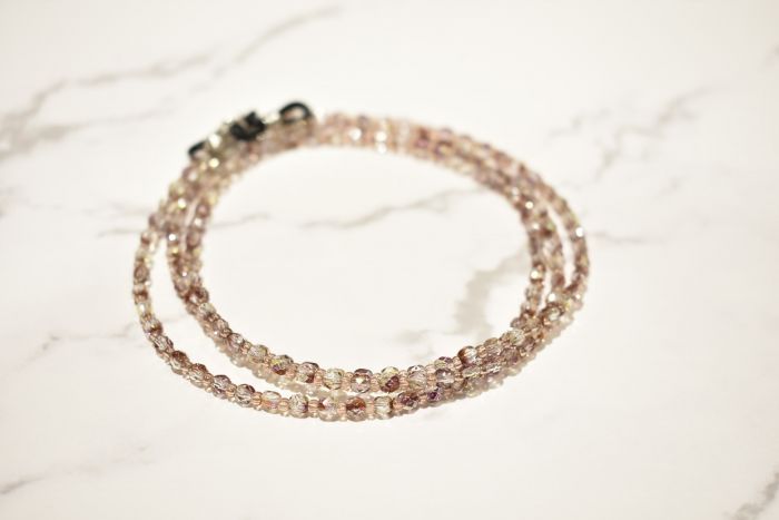 粒ビーズはクリアピンクで、オールビーズ製でも涼しげになりすぎないカラーリング。